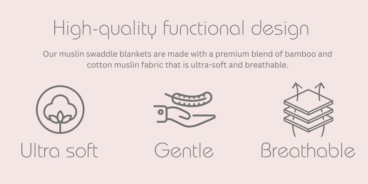 Our super-soft and breathable Muslin Swaddle for Babies is the perfect accessory for your little one! Measuring 47 x 47 inches, our swaddle is the ideal size for wrapping up your baby and providing them with a cozy and comfortable sleep. Made with two layers of premium bamboo fiber and organic cotton, this swaddle is ultra-soft and gentle on your baby's delicate skin. The breathable fabric helps regulate your baby's body temperature, preventing overheating and ensuring a restful sleep.