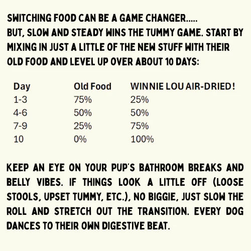 Winnie Lou's Gently Air-Dried Dog Food is HERE! Why food? Because we saw the problem. Too many bags filled with synthetic vitamin packs, cheap fillers, high-heat processing, and marketing buzzwords that don't deliver on health. So, we spent two years formulating with board-certified veterinary nutritionists, working directly with trusted farms, and perfecting recipes using only whole-food ingredients. NO synthetics. NO by-products. NO shortcuts.