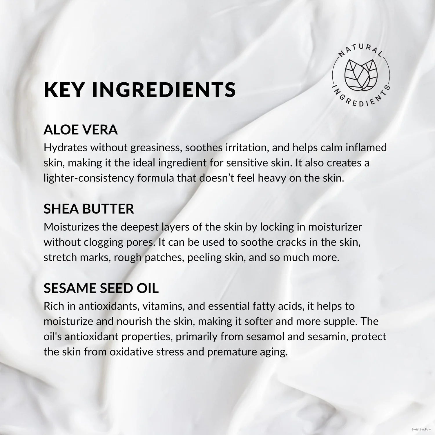 ALOE VERA: Hydrates without greasiness, soothes irritation, and helps calm inflamed skin, making it the ideal ingredient for sensitive skin. It also creates a lighter-consistency formula that doesn't feel heavy on the skin.