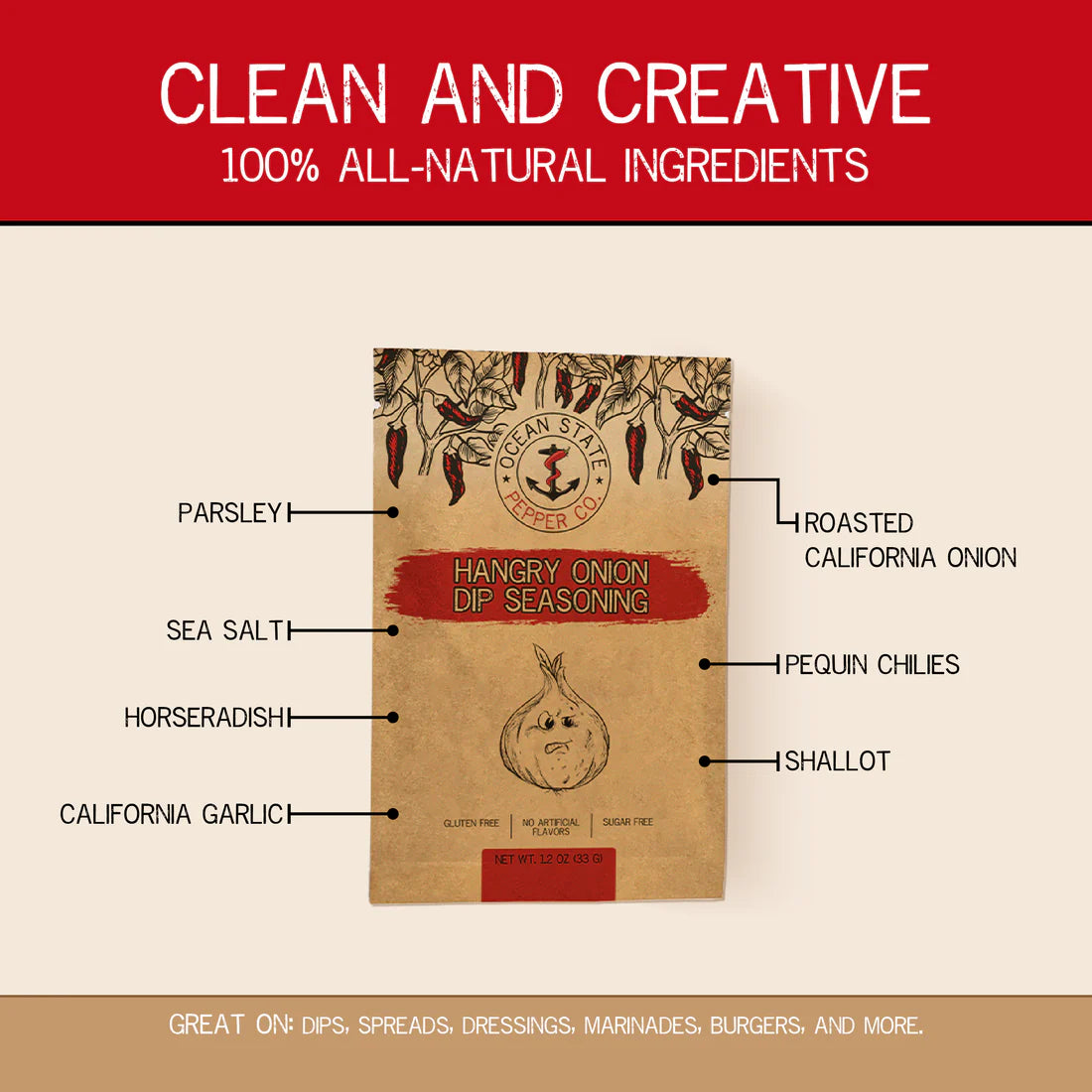 It’s like French onion dip, only hangrier. A perfect party favor, this bold blend of seasonings makes a wonderfully zesty dip perfect to have on hand for any occasion...in about 30 minutes time. You can expect an upfront smack of roasted California onions, and air-dried shallots, followed by a nice citrus tang, a bite of horseradish, and a little heat from our pequin chilies.