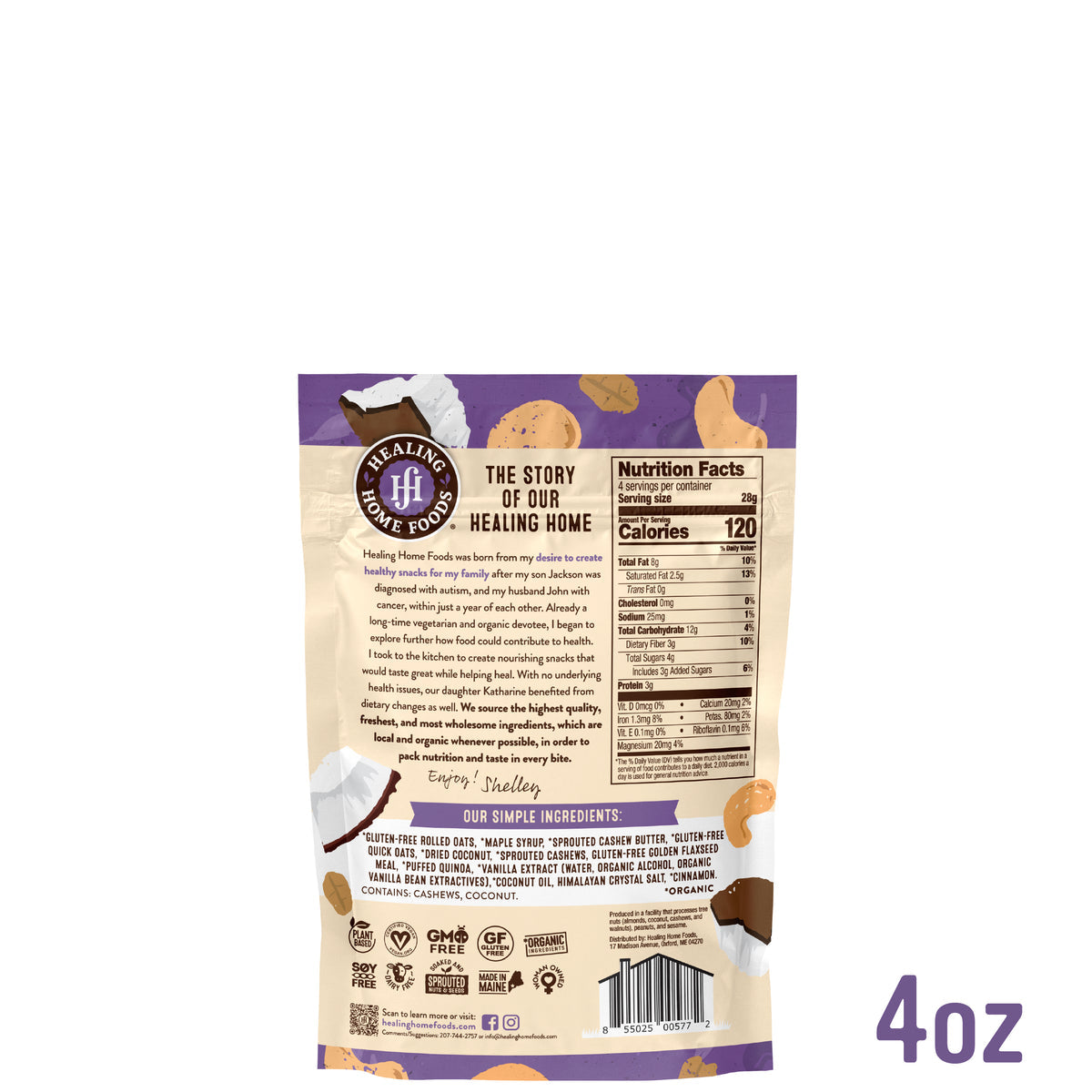Ingredients: Organic gluten-free rolled oats, organic maple syrup, organic sprouted cashew butter, organic gluten-free quick oats, organic dried coconut, organic sprouted cashews, gluten-free golden flaxseed meal, organic puffed quinoa, organic vanilla extract (water, organic alcohol, organic vanilla bean extractives), organic coconut oil, Himalayan crystal salt, organic cinnamon