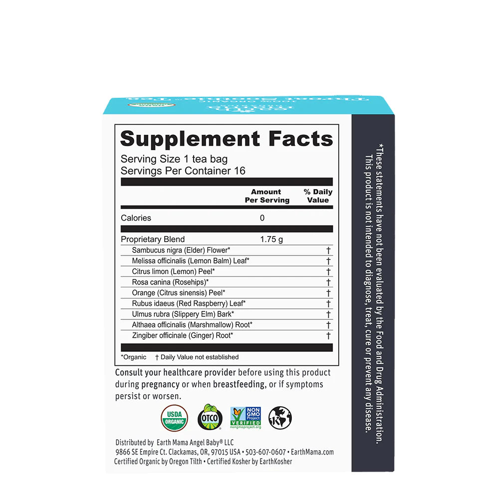 Ingredients: Sambucus nigra (Elder) Flower*, Melissa officinalis (Lemon Balm) Leaf*, Citrus limon (Lemon) Peel*, Rosa canina (Rosehips)*, Orange (Citrus sinensis) Peel*, Rubus idaeus (Red Raspberry) Leaf*, Ulmus rubra (Slippery Elm) Bark*, Althaea officinalis (Marshmallow) Root*, Zingiber officinale (Ginger) Root* *Organic