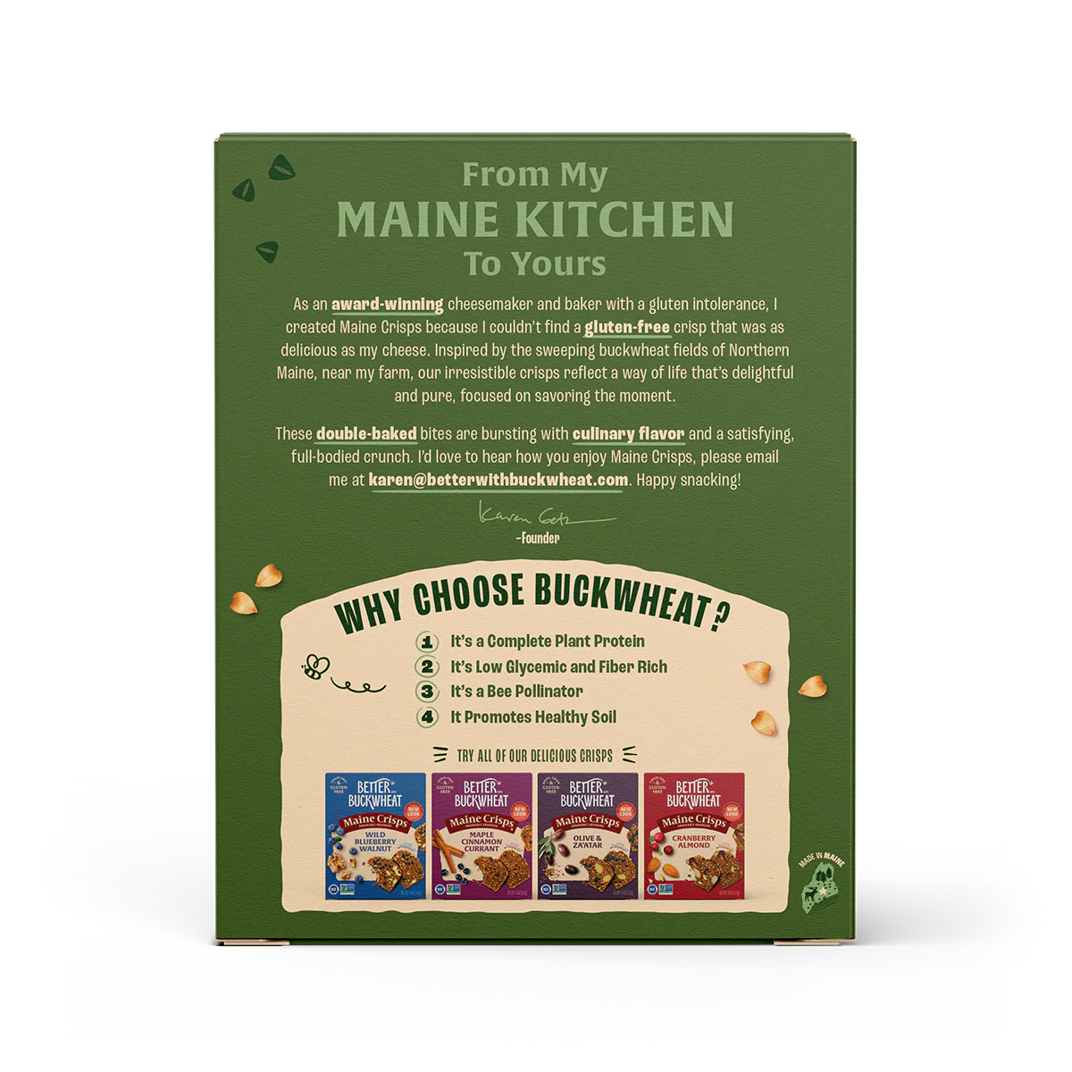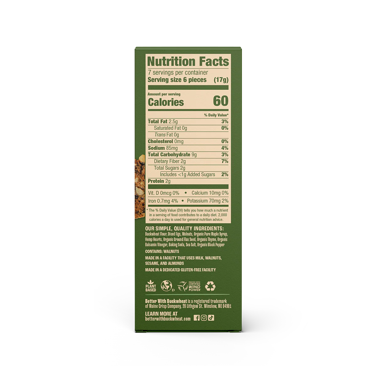 Our Simple, Quality Ingredients: Buckwheat Flour, Diced Figs, Walnuts, Pure Maple Syrup, Hemp Hearts, Organic Ground Flax Seed, Organic Thyme, Balsamic Vinegar, Baking Soda, Sea Salt, Organic Black Pepper
