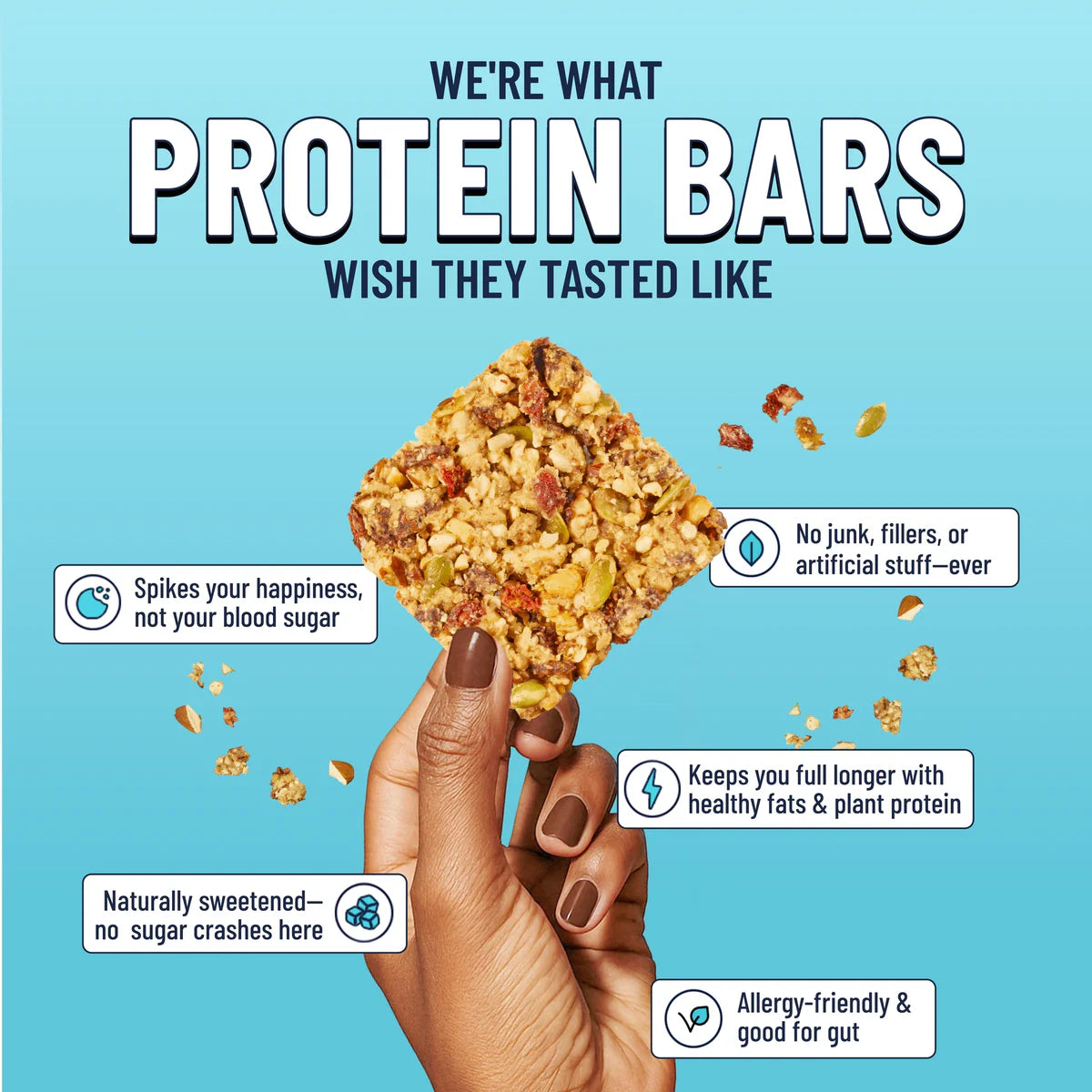 Taste summer anytime with tangy California strawberries, macadamia nuts, creamy coconut butter, vanilla and white chia seeds. This chewy plant-based bar crumbles pleasingly over yogurt and also tastes great on its own. Perfect for crumbling over your favorite yogurt, in between meals or after a workout.