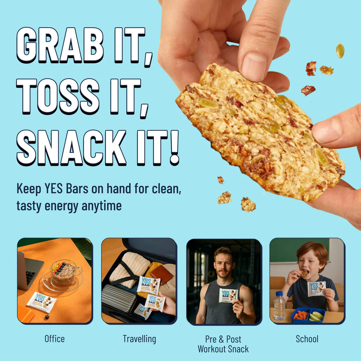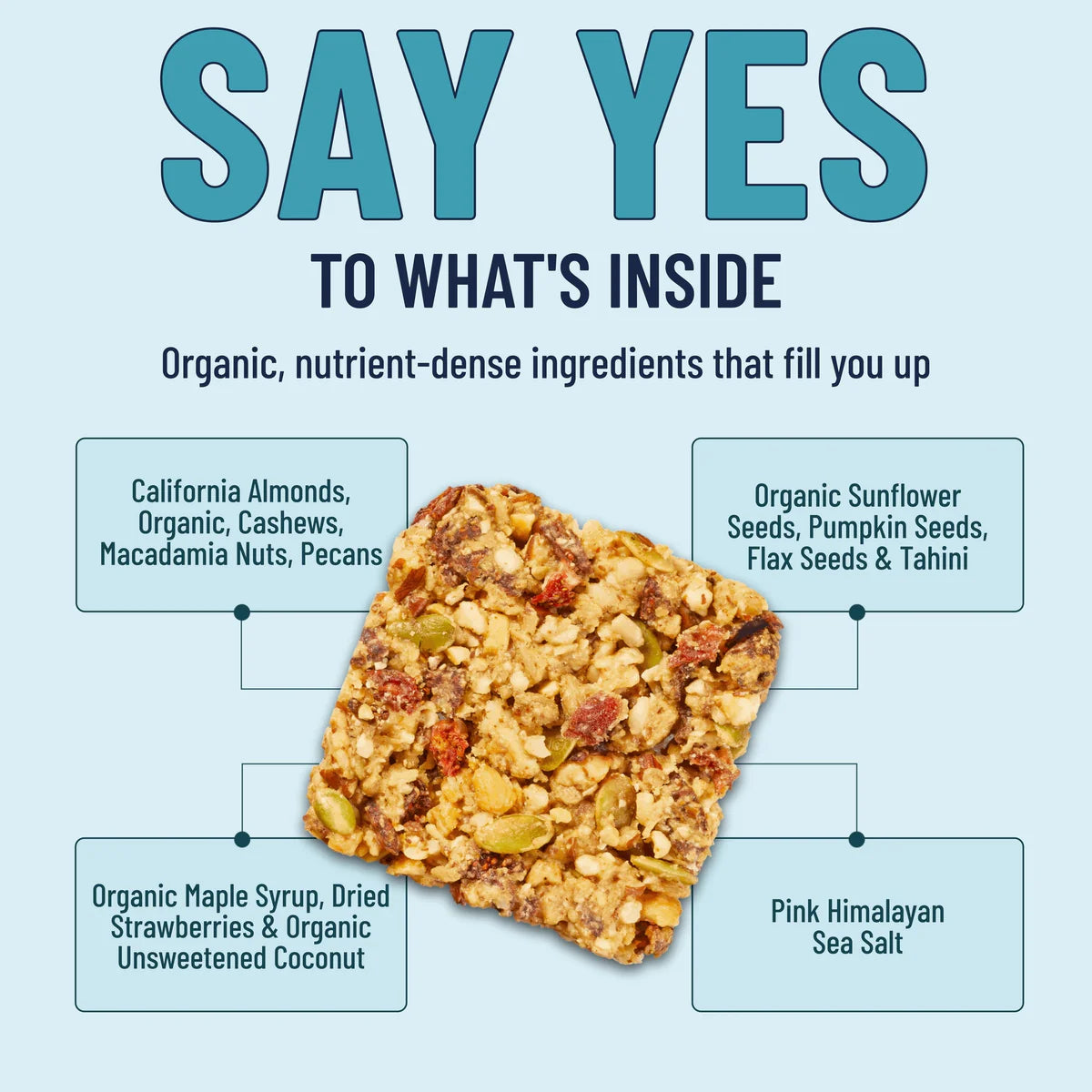 YES Bars are fully plant-based, paleo, & vegan and free of GMO’s, gluten, grains, dairy, corn, soy, eggs, & peanuts. They’re perfect for the whole family to enjoy.