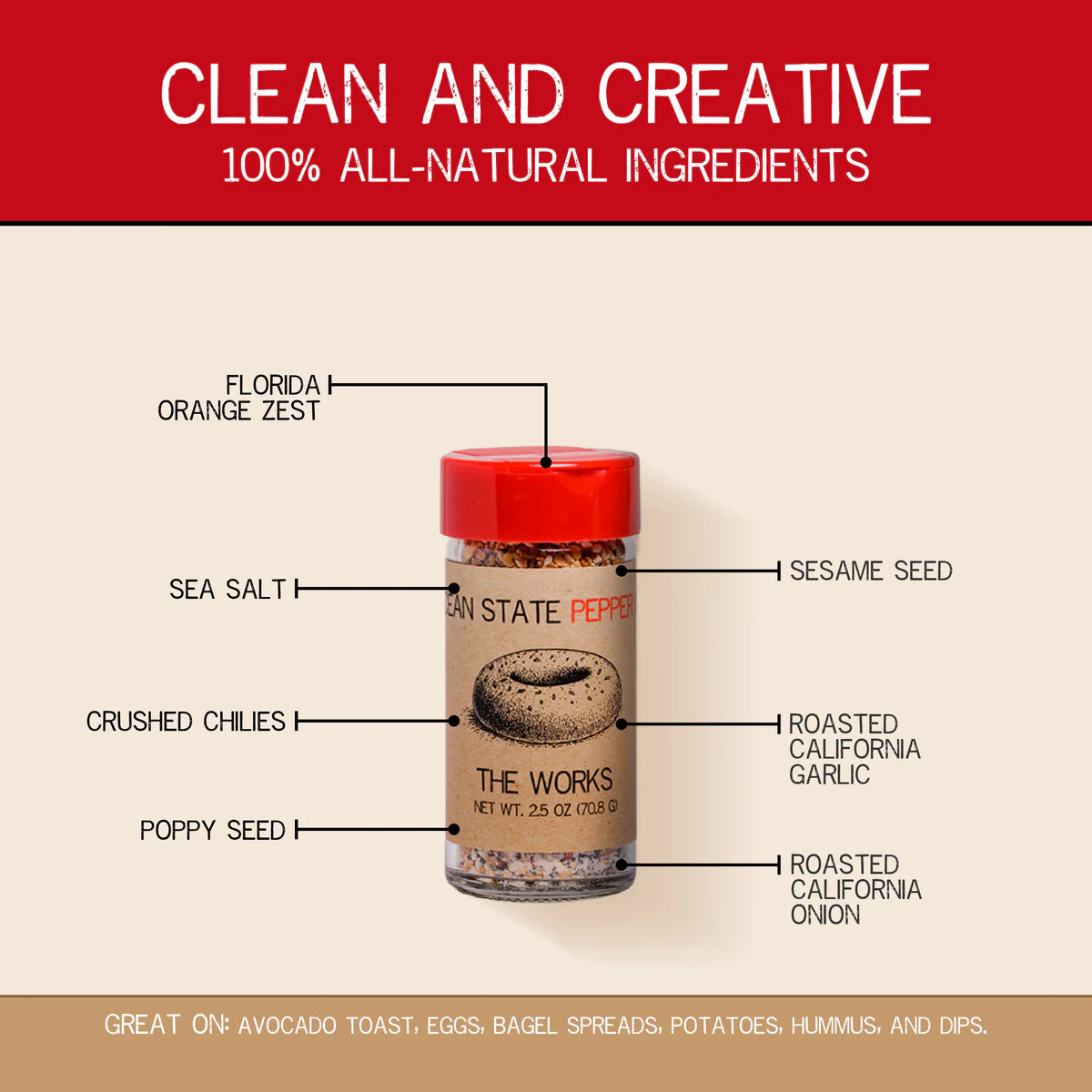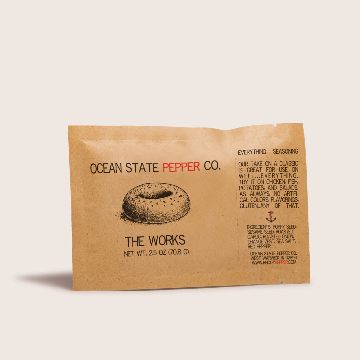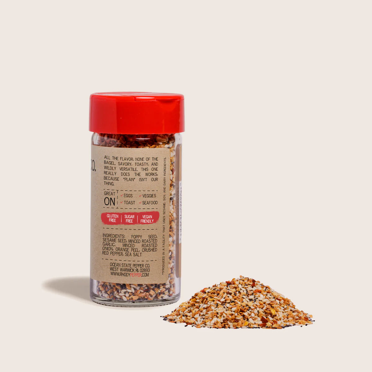 INGREDIENTS: POPPY SEED, SESAME SEED, MINCED ROASTED GARLIC, MINCED ROASTED ONION, ORANGE PEEL, CRUSHED RED PEPPER, SEA SALT