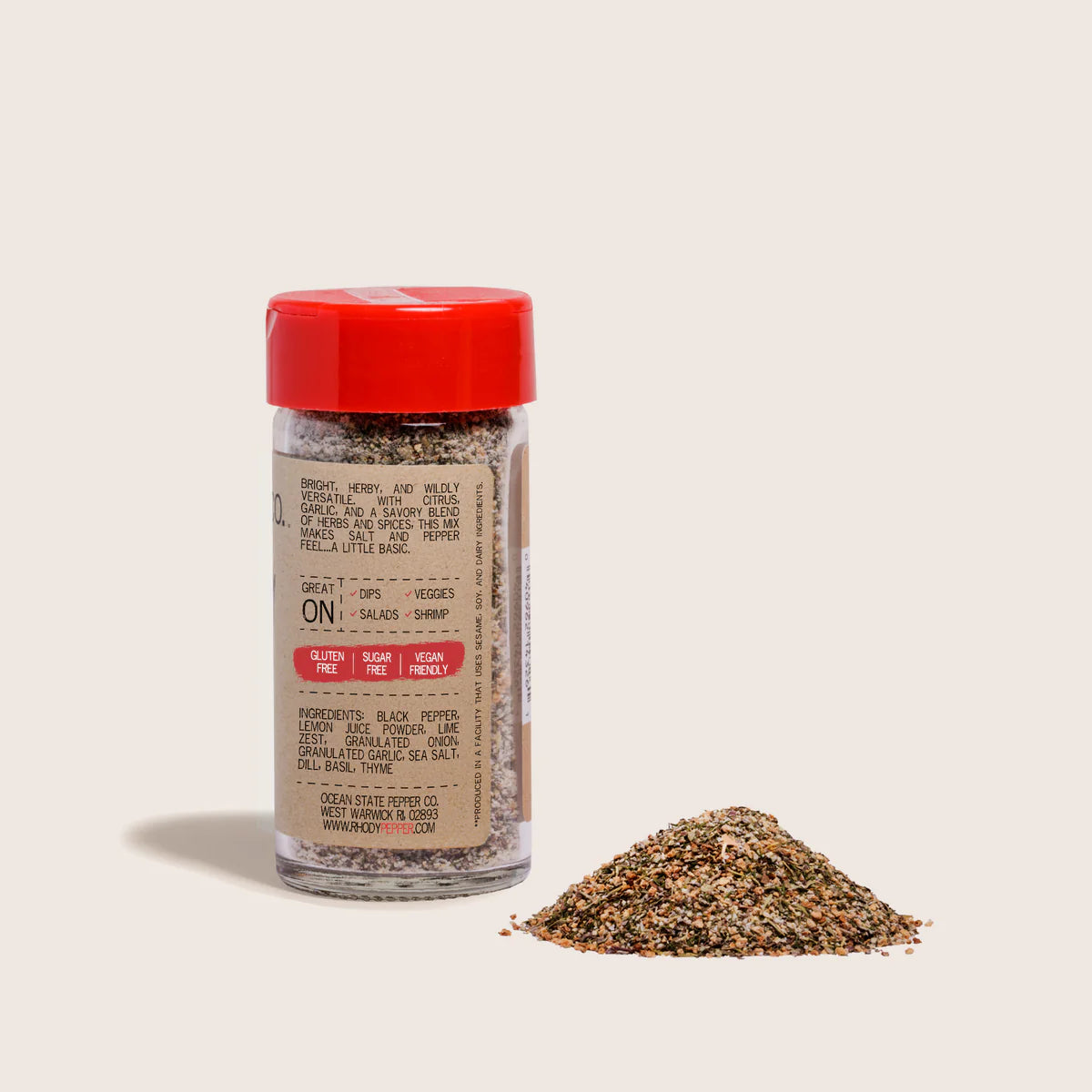 INGREDIENTS: BLACK PEPPER, LEMON JUICE POWDER, LIME ZEST, GRANULATED ONION, GRANULATED GARLIC, SEA SALT, DILL, BASIL, THYME