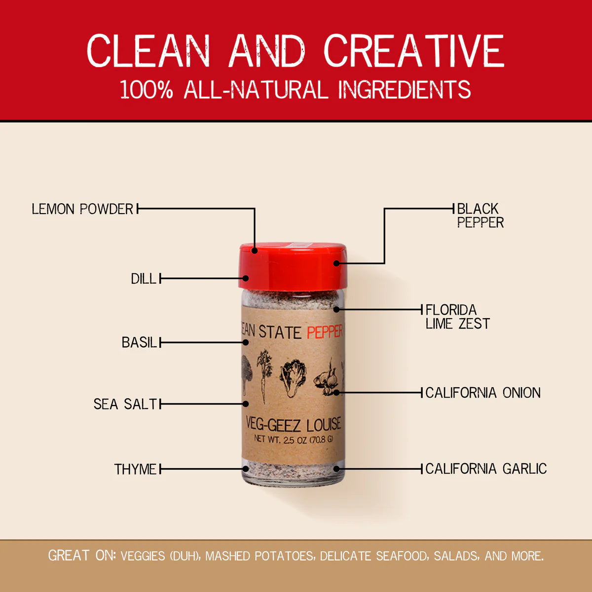 The perfect combination of herbs and spices to season any dish. Our blend of sea salt and pepper, combined with bright notes of citrus, savory onion and garlic, and a fresh blend of herbs make it tangy and delicious...not to mention, extremely versatile. Add the perfect flavor to your meals with Veg-geez Louise! Just get rid of your salt and pepper shaker...you won't need them.